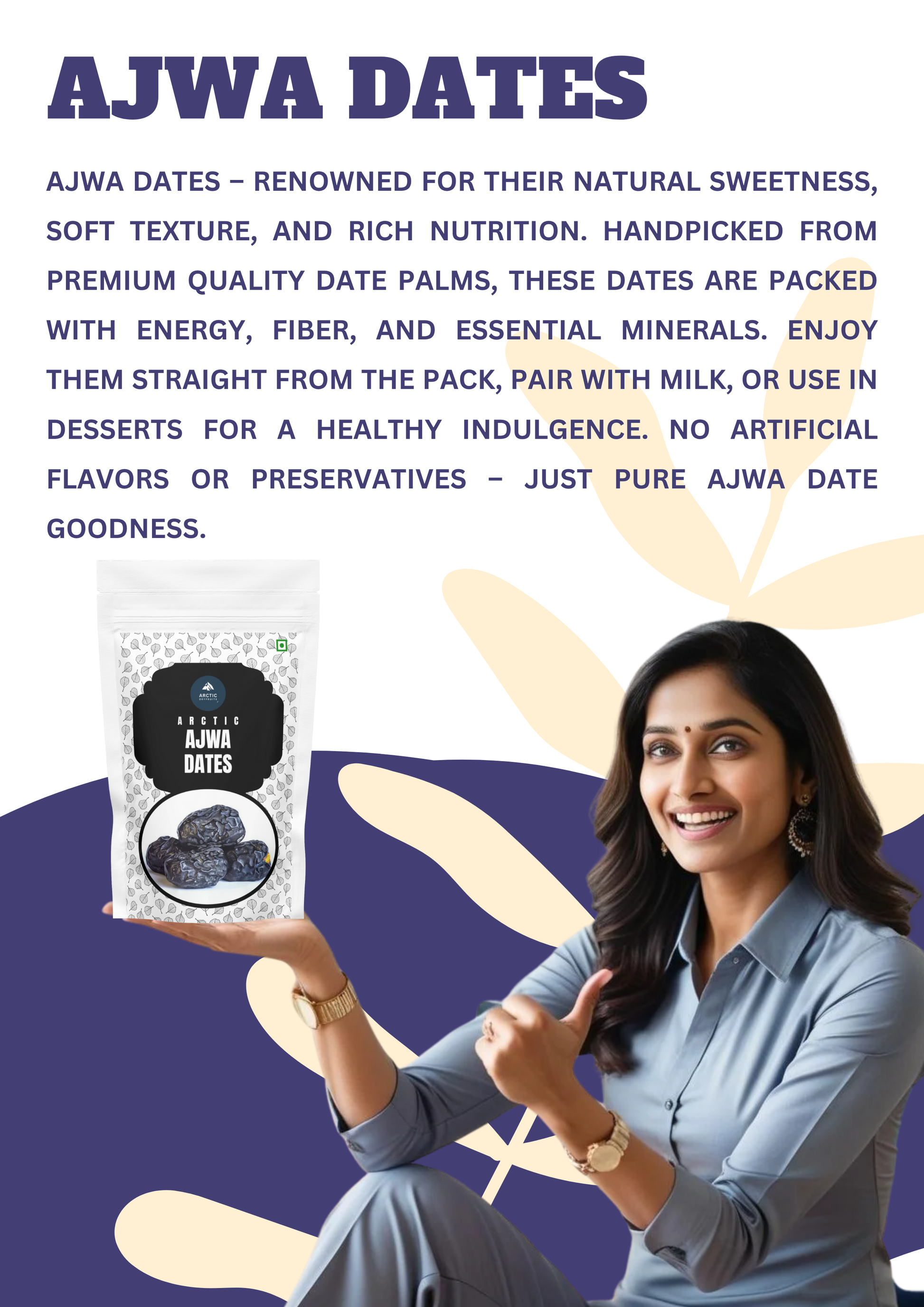 Ajwa Dates are a premium variety of dates traditionally grown in the Medina region of Saudi Arabia. They are valued for their soft texture, rich taste, and distinctive appearance.