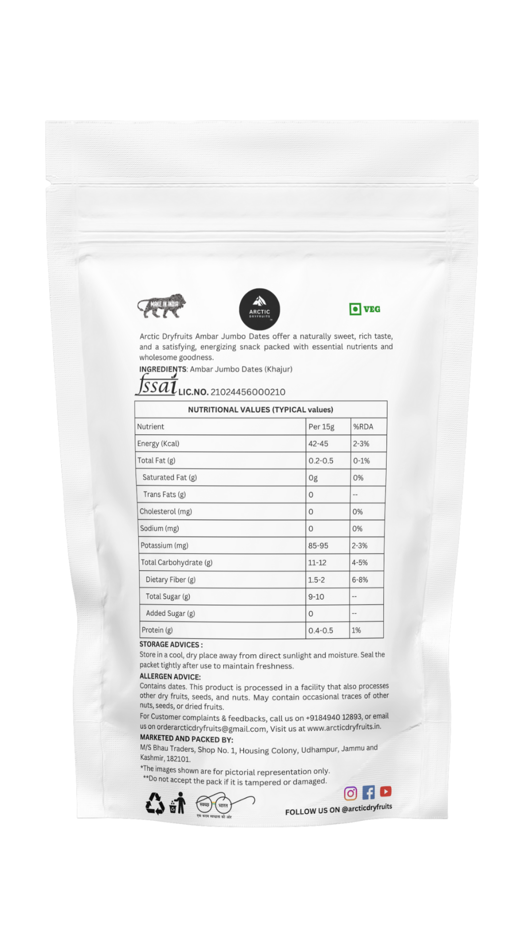 Experience the pure delight of Arctic Dryfruits Premium Ambar Jumbo Dates, carefully handpicked and naturally dried to preserve their exquisite flavor and rich texture. These dates offer a naturally delicious treat for all to enjoy.