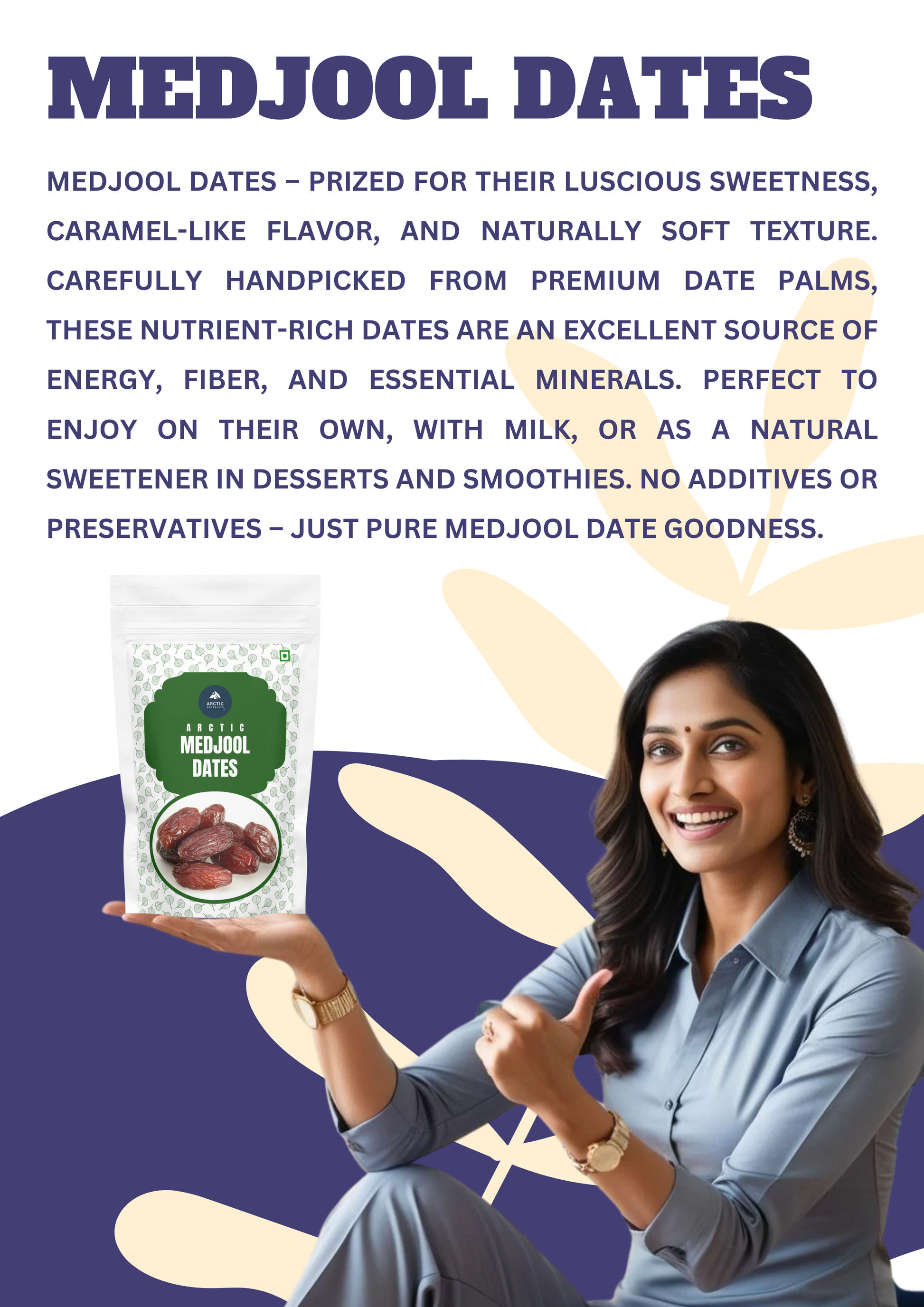 Medjool dates are a great source of natural sugars, fiber, potassium, and antioxidants. They help with digestion, provide quick energy, and support heart health. -