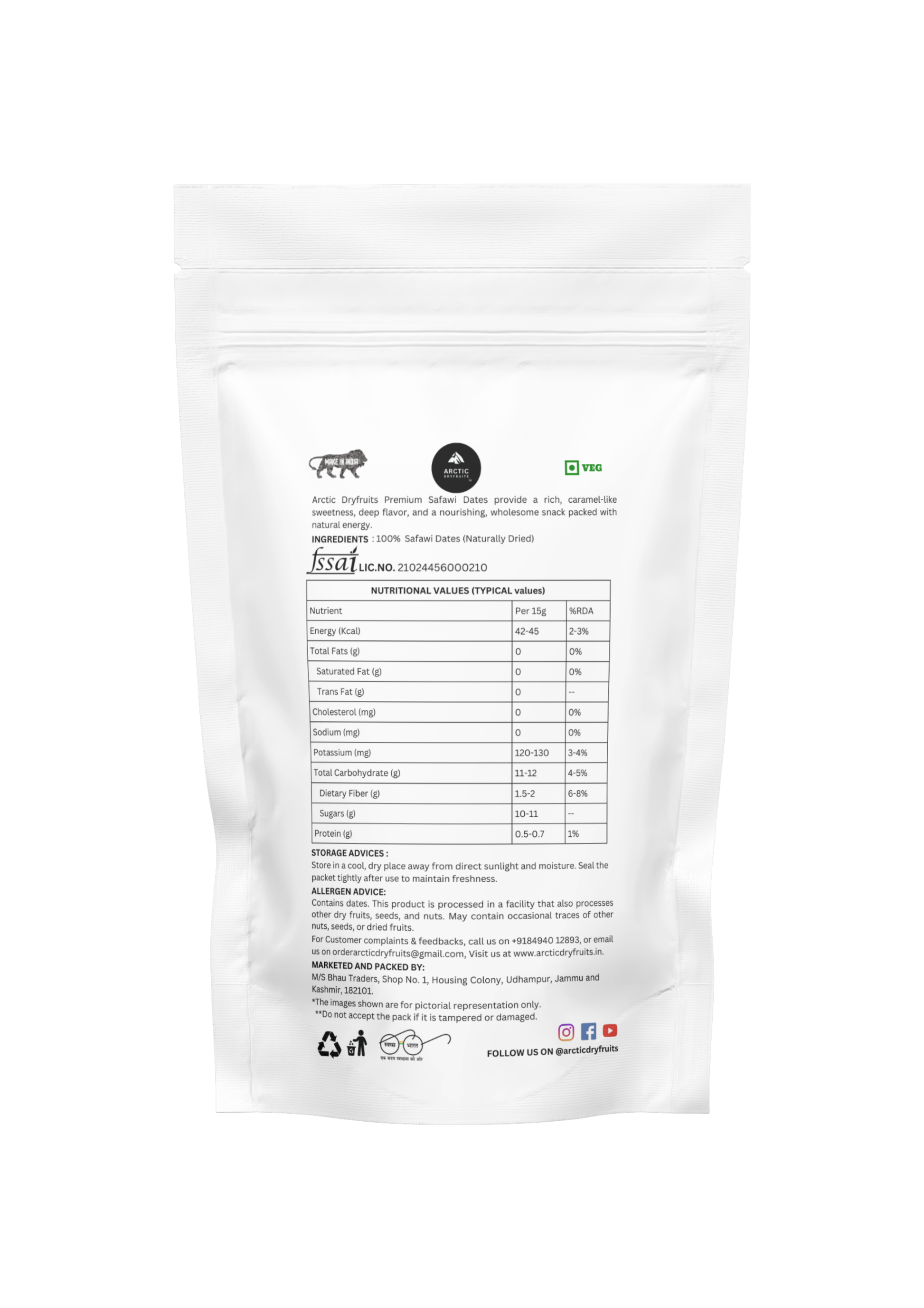 Enjoy the rich taste and premium quality of Arctic Dryfruits Safawi Dates, known for their dark brown color, slightly wrinkled texture, and naturally sweet flavor. Carefully selected for their exceptional quality, these dates offer a delightful snacking experience.